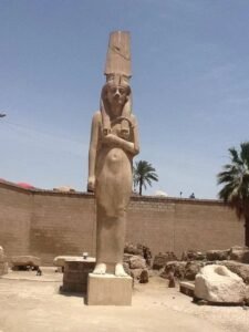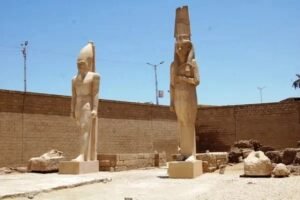 في فُسحة من فسحات بلد المواويل، وتحديدًا من قلب مدينة أخميم، يبرز تمثال ميريت آمون كأحد أعظم الاكتشافات الأثرية في مصر. عُثر على التمثال عام 1981، ويُعد أطول تمثال لملكة مصرية متوجة في التاريخ، بارتفاع 13 مترًا ووزن 31 طنًا. ميريت آمون هى ابنة الملك رمسيس الثاني من زوجته نفرتاري، وحملت لقب الزوجة الملكية، كما كانت كاهنة للإلهة حتحور. التمثال مصنوع من الحجر الجيري، ويجسد روعة الفن المصري القديم، كما يضم المعبد تمثالين للملك رمسيس الثاني وتمثالاً رومانياً مقطوع الرأس إلى جانب أعمدة وبقايا جدران وأربعة أبار مياه تعود  إلى العصر الروماني